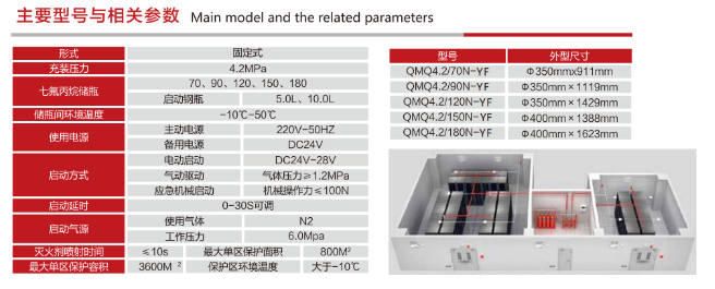 注: 管网七氟丙烷灭火系统型号表示:如 QMQ4.2/90N。 QM——气体灭火系统; Q——灭火剂类型为七氟丙烷(第二个 Q); 4.2——贮存压力为4.2Mpa; 90——灭火剂瓶组容积为 90L; N——内贮压式; |