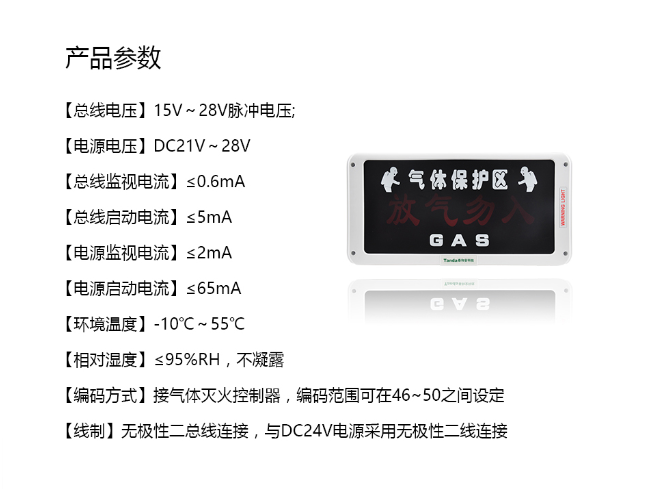 | 编码方式 | 接气体灭火控制器,编码范围可在46~50之间设定 |